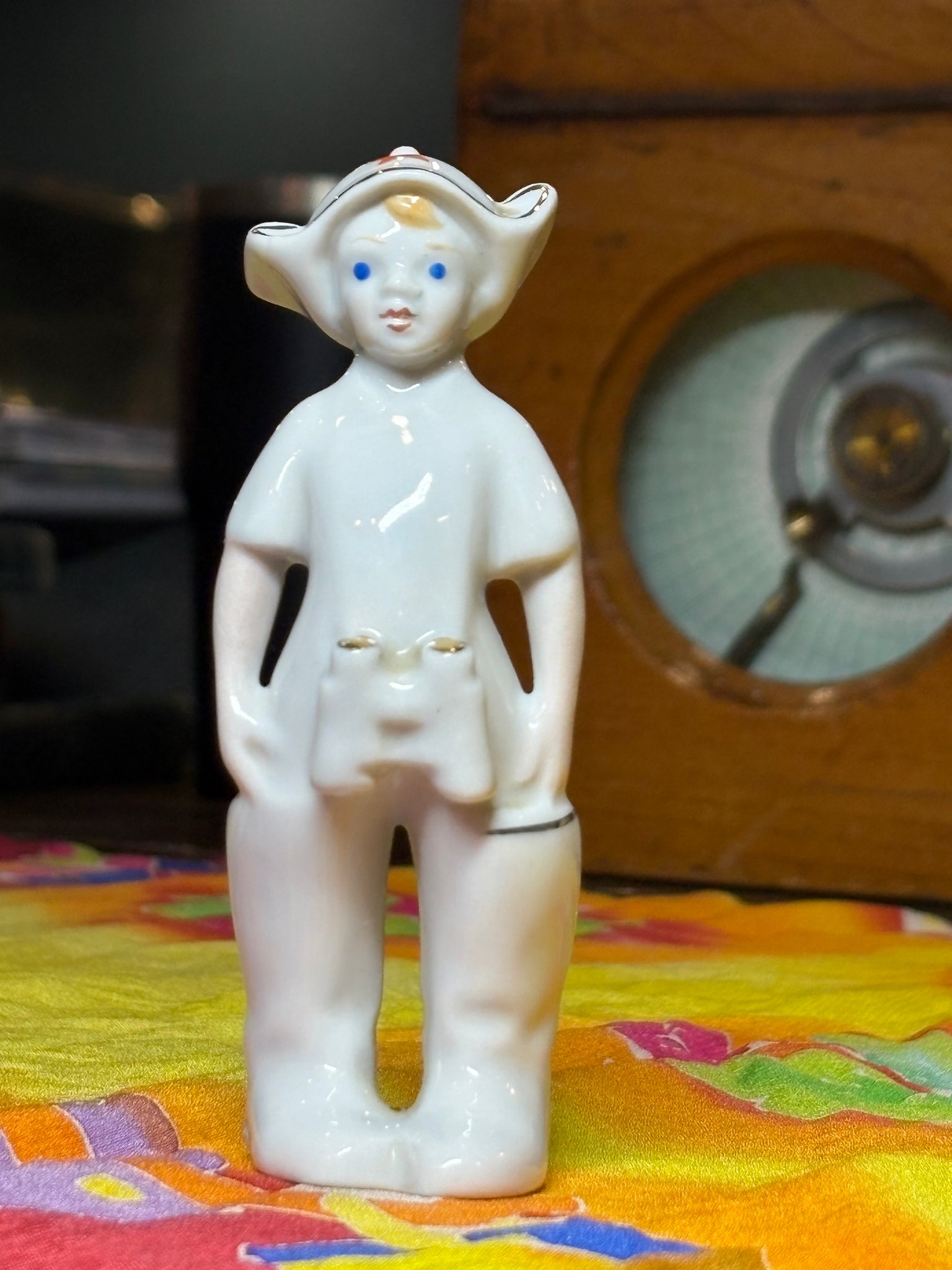 Charming mid-century Soviet porcelain figurine depicting a Young Budenovets Boy – a Red Army-inspired child figure wearing the iconic pointed hat with a red star and holding a pair of binoculars. Made at the Polonnoe Porcelain Factory (Polonne, Ukraine, USSR), this piece captures the stylised optimism of post-war Soviet design.